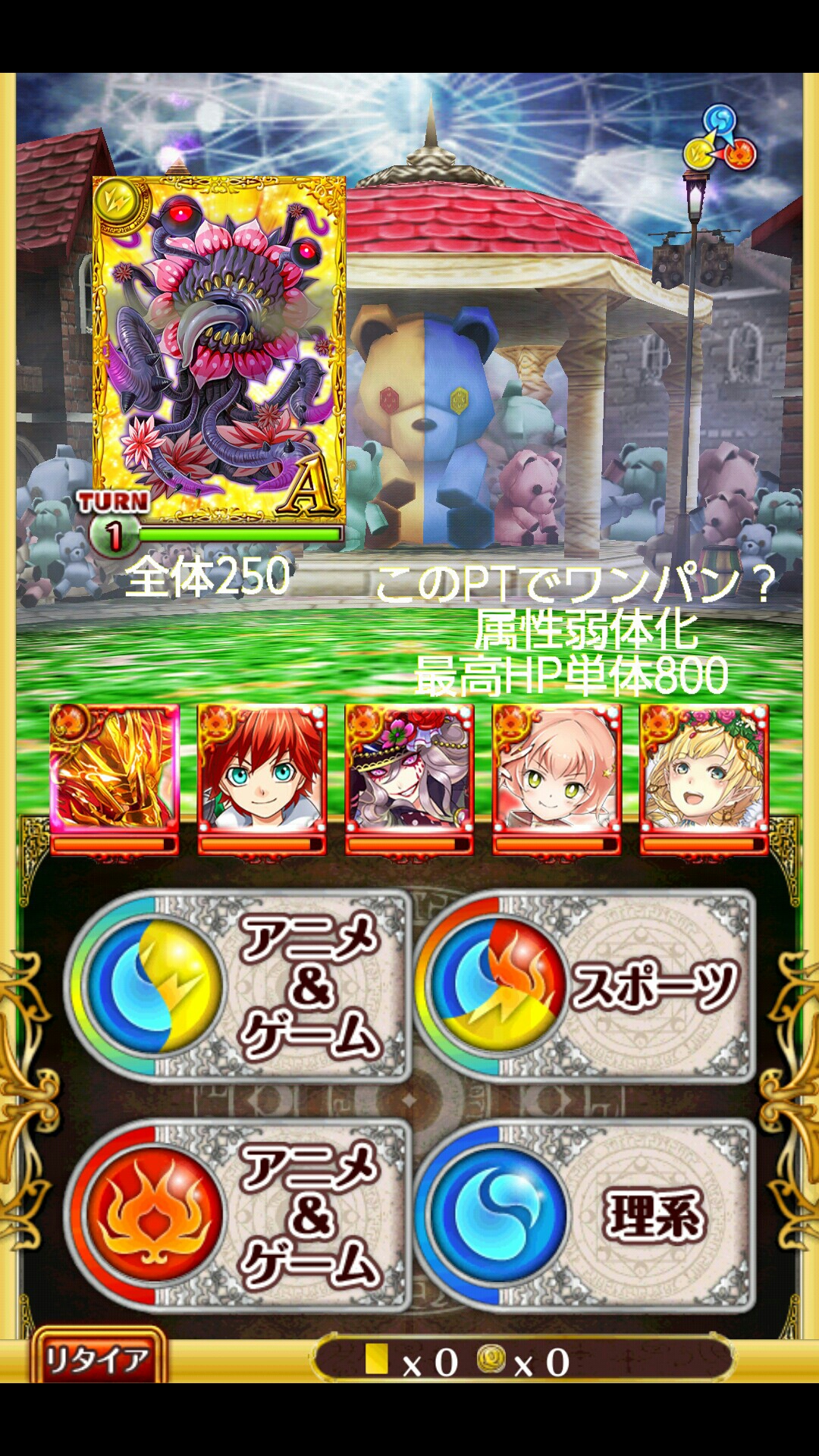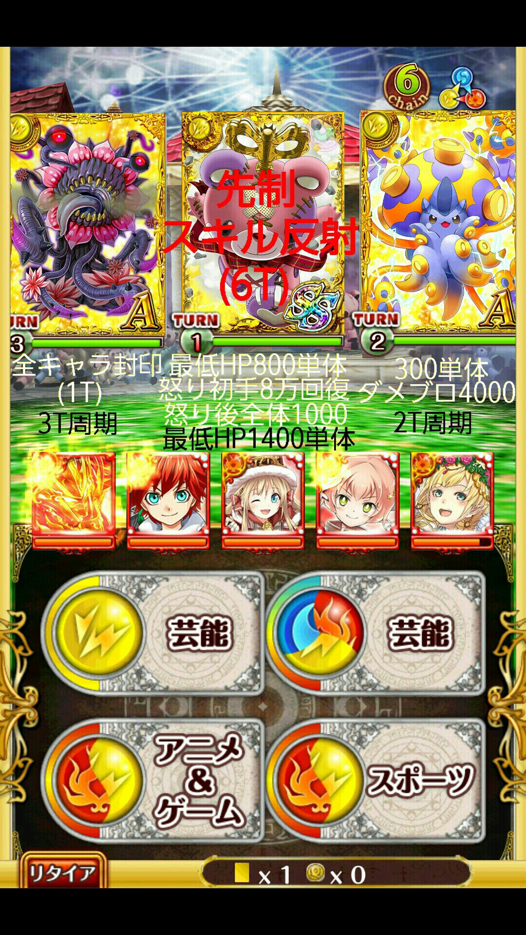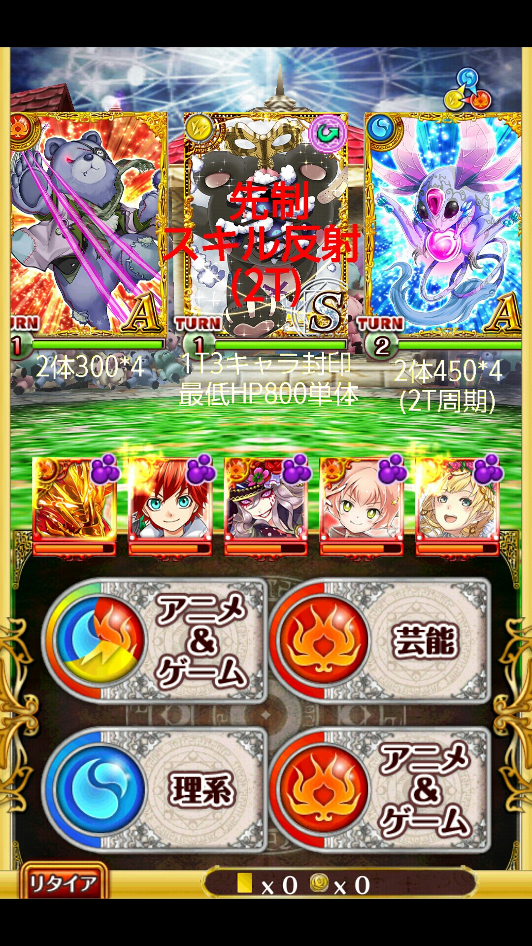 オルハレポート03 グヴェル ガルタス(AS7チェイン時パネル色攻撃・SS赤青変換)フル覚+200白猫(AS属性加護+パネル色攻撃・SS3色変換)フル覚+200イグニス(AS3チェイン攻撃・SS全体攻撃)フル覚+200夏アレク(AS回復・SS見破り)フル覚+200グレイス(AS回復・SS状態回復)フル覚助っ人は変換なり遅延なり適当に保険きくやつミスらなければ来ないガルタス・白猫・グレイスが鍵イグニスはユアンとかでもいけそうだし夏アレクはチェインの保険用だから他でも可ていうかガルタス→ユアンとか夏アレク→アニマでも遅延助っ人で行けた -----1戦目左右左をワンパン、右を2T3チェインためとく2戦目右左右は2T、左は1Tだけど最速抜けすると封印がとけないから、左残して1問空踏み抜けた時点で6チェインが必須条件パネルが怪しいならガルタスで変換体力が怪しいor抜ける時にグレイスSSで回復3戦目右中左開幕に2色を踏んで右をワンパン、中央も早めに倒す理想はガルタスの変換を使ってそれぞれワンパンで仕留めてくことボス戦で開幕から最速で3色を2連続で踏みたいから白猫の変換は残しとかないと厳しいボス3色を最速で2連続で拾えるなら中右左難しいなら右左中左右は体力低いからどっちもワンパン中央へ3色2枚で行動させずに撃破可能左右から片付ける場合は早めに怒らせて一度回復させてから全力攻撃全体→単体→全体を交互に繰り返すから適当なとこでグレイスの回復を挟んで時間を稼ぐ [0回]PR