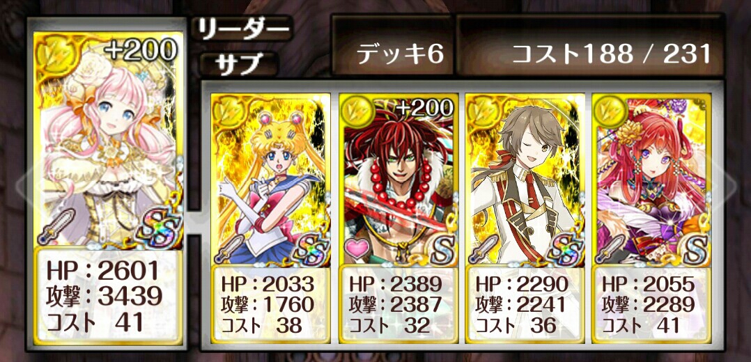 セーラームーン2匹の黒猫 月光級 サブクエ戦士縛りガイエン(AS属性特攻・SS水軽減)フル覚+200セーラームーン(AS全体攻撃・SS400ダメブロ)パワ(AS戦士数アップ・SSスキルチャージ)フル覚+200シンジ(AS怒りの嘆き・SS蘇生)フル覚シンジ助っ人ファム つづきはこちら [0回]