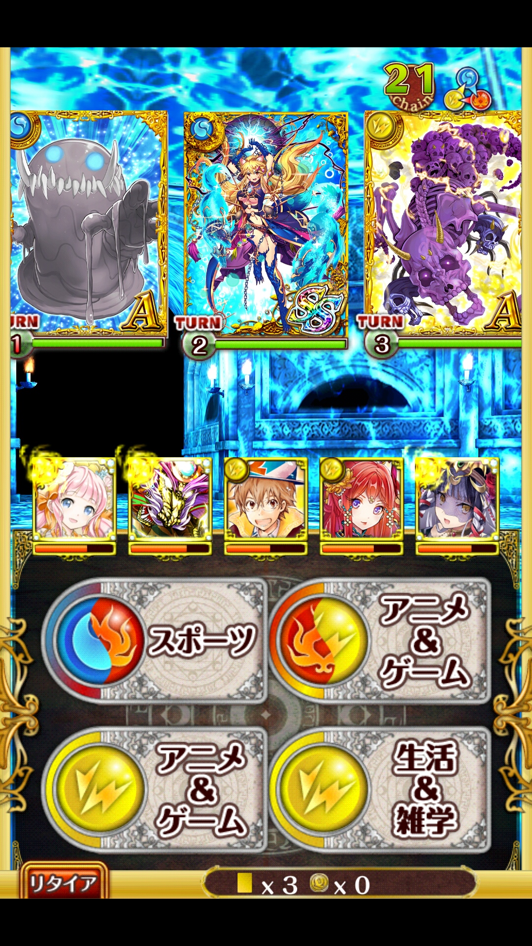 リュコス 別デッキ ファム(AS特攻・SS遅延)フル覚+200タケミカヅチ(AS8チェイン・SS単体攻撃)3覚+200識(AS複色攻撃アップ・SS見破り)フル覚トモエ(AS回復・SS変換)フル覚黒パッツァ(AS回復・SS見破り)フル覚助っ人はファムが安牌だけど何でもいい今までのより安定感も周回速度もアップとにかくチェインを切らさないことトモエは他でも良さそうだけど変換使うことあるし最後が結構HPギリギリになることあるからトモエで -----1戦目中央を2回殴るこのとき複色を使えば倒せるけど、倒せないほうが良いガード発動したら2回殴って中央処理、そのあとゆっくり左右4T凌げばパッツァのSSが使えるので最初の4Tが肝ミスってもそこまで惨事にはならない必ず8チェイン溜まった状態で抜ける2戦目ファム左、残りを右でワンパンしてから左に総攻撃そのあと右を殴れば行動前に倒せる全部単色だったり、ファムやタケミカヅチが低乱数だと少し怪しいかもしれないから、不安なら1枚は多色で識をブーストして殴る3戦目右にタケミカヅチSSそのあとファムとタケミカヅチは右、残りは左でワンパンあとは左を殴り続ければ行動前に倒せる1問は空踏みできそう中央は2Tで倒せる4戦目開幕遅延パネル状況が良いならファムだけ左で残りは右でタケミカヅチのSSも基本的には右止まらなければどちらも行動前に倒せる最悪でも左は仕留めることガードを発動させてしまったら遅延がたまり次第使って、ガードの切れ目に殴るリュコス自体は6Tくらいで倒せるスムーズに行くと29〜33Tくらい乱数次第のところではあるけど少なくとも道中の肝心な部分は崩れない [0回]PR