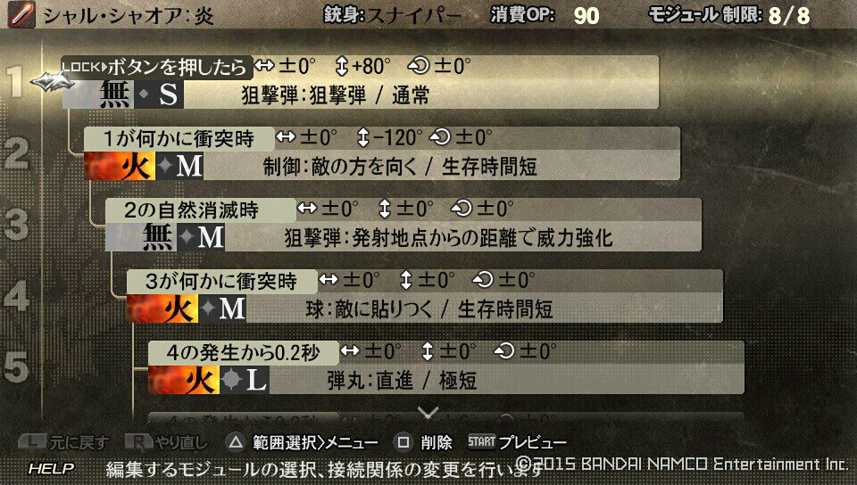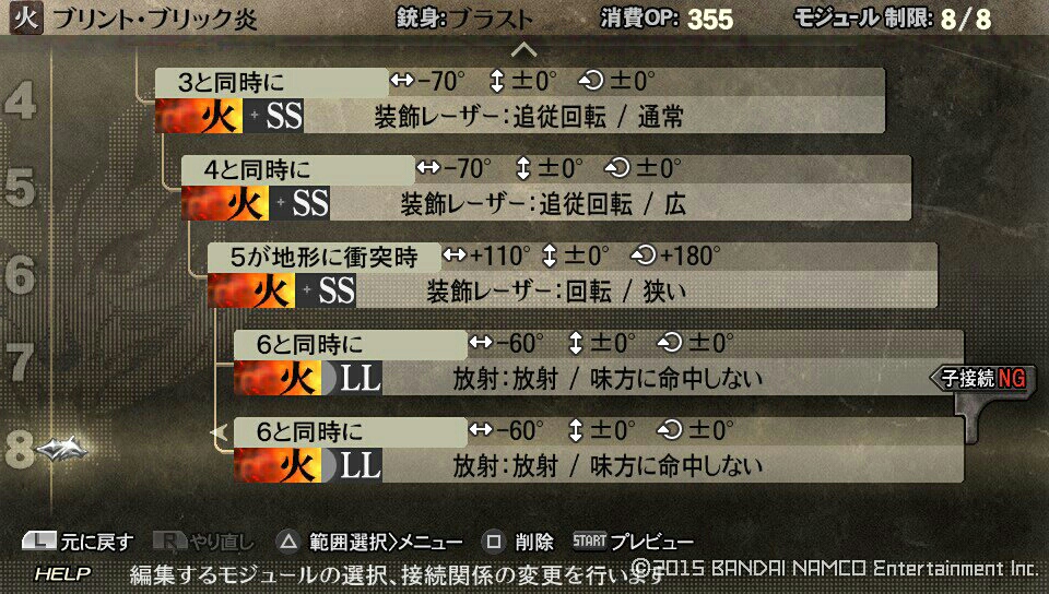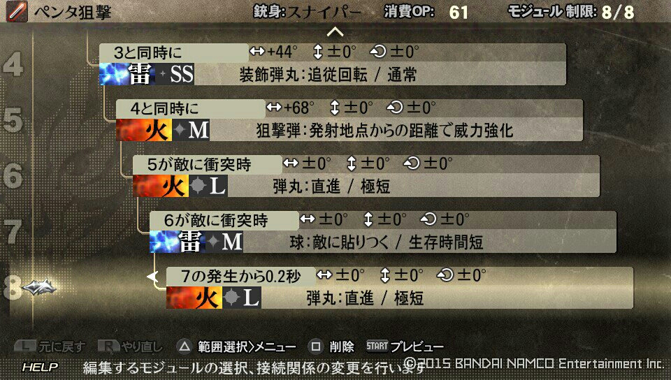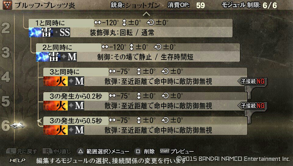 GER自作バレット(銃身ごちゃ混ぜ) 手近な場所なんでここで自作ってほど独創性あるもんでもないですが※1/8追加 ----------狙撃弾、貫通バレット-----■きりもみ狙撃弾 NEWスナイパーで作成時OP62、貫通557〜616〜786下に貼ってあるペンタ狙撃弾ふたつよりDPOが向上してるバレット右と後ろに通常時の1ステップ弱、左に半ステップ、前に1ステップ強のスペースが必要なのが難■脳天直撃スナイパーで作成時OP90、貫通1085アサルトとショットガンは最後の弾丸を削る遠すぎなければエイムなしで適当に撃っても当たるまぁ当たりづらいと感じるなら適当に調整節約あればスナイパーならOP150で2発撃ち切り子接続の弾丸サイズと数はお好みで方向補正を削ったせいで絶妙な距離でヒットしないところがある■ペンタ狙撃弾1スナイパーで作成時OP70、貫通539〜610〜792アサルトとショットガンは後半の弾丸を削る必要スペースは前に1ステップ分だけで背中は壁にほぼ密着してても撃てるのが強み子接続の弾丸サイズや数はお好みでDPOがあんまよくない■ペンタ狙撃弾2スナイパーで作成時OP61、貫通528〜578〜730アサルトとショットガンは後半の弾丸を削るDPOはひとつ前のより上だけどこっちは密着してると当たらなくて背中側にも1ステップ分のスペースが必要その他エイムとかに関しては同じ-----爆発・放射バレット-----■速射機構ペンタボム NEWブラストで作成時OP152、破砕900スナイパー・ブラスト限定目の前へ抗重力爆発+速射機構のバレットいろいろ無茶してるから水平撃ちかジャンプ撃ちでしか撃てないスペースに関しては後ろに1キャラ分前に半ステップ分くらいスペースがあれば撃てる速射部分を削ればアサルトとかでも作れるけどそれなら別の構造の方が良い■接射爆破弾ブラストで作成時OP74、破砕380全銃身共通自分の目の前を爆破、ジャンプ撃ち可L爆発単発よりDPOは上装飾は目障りなら雷弾丸に変えるとマシDPSも欲しいなら素直にL爆発単発で■抗重力エピオンブラストで作成時OP193、破砕1044スナイパー・ブラスト限定真正面に放射を飛ばすバレットかなり高めへエイムしても出る崖に立ってなければ大体どこででも撃てるけど登り坂や起伏が激しい所だと不発しがちなので注意抗重力L放射2本よりDPOは上でL爆発単発と比べてもそんな下がらないし2体以上へ当てればDPOは優秀判定がでかくて綺麗に当てづらそうなことが問題雑魚やシユウの芋洗いには充分使える■抗重力JGPブラストで作成時OP355、破砕1984スナイパー・ブラスト限定ひとつ前のと比べると遠くへの着弾が早くて上方向への厚みが薄くて、射程距離が短めエイムは不可たぶん崖へ前向きに立つ以外では撃てるけど地面のちょっとした起伏で不発しやすいので平地での水平撃ち推奨、芋洗い用速射ついてないから放射1本の方が使いやすそう-----散弾バレット-----■アッパー徹甲散弾ショットガンで作成時OP59、破砕254・貫通254全銃種共通徹甲散弾に識別が付けられないから全体を上方向へ向けて前方向へあまり飛ばないようにしただけ前は制御のあたりまでしか当たらないけど上に味方がいたら容赦なく撃墜するから注意スナイパーとかで作るなら回転制御にして最後は自然消滅時で散弾出したほうがスムーズ [0回]PR