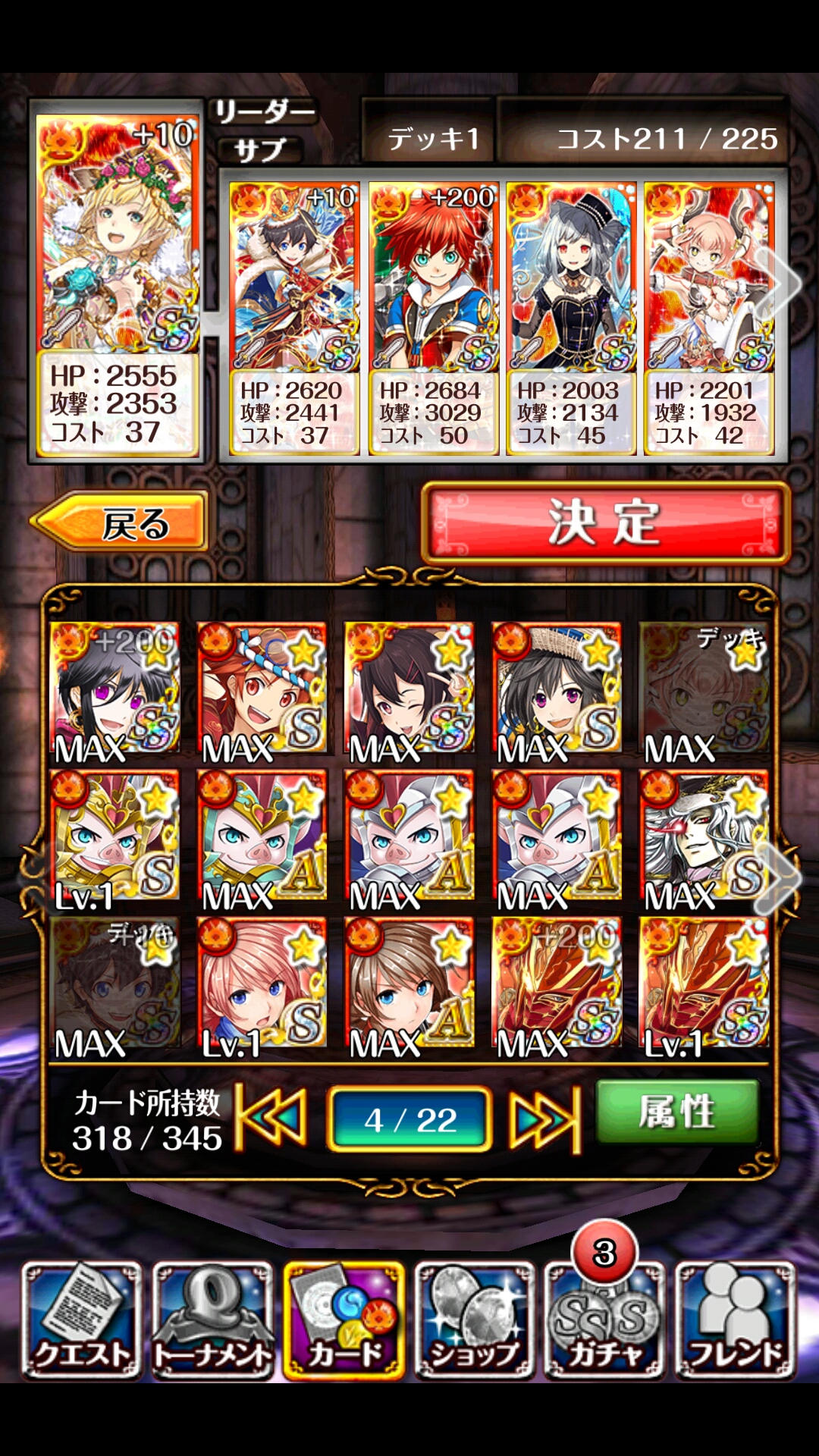 スビェート 別デッキ グレイス(AS回復・SS状態回復)フル覚フェイ(AS回復・SS全体回復)フル覚白猫(AS属性加護+パネル色攻撃・SS3色変換)フル覚+200セリナ(ASエンハンス・SS毒)2覚アニマ(AS回復・SS遅延)フル覚助っ人はリヴェータ15枠の人のデッキ大半のパクり構成運が良くてノーコンできたけど基本は1コン周回はまだきついから初回報酬もらうだけのデッキ -----1戦目左右特にスキル溜めは意識しなくてOK2戦目右左右を総攻撃、毒を受けたらセリナSS>グレイスSSそのまま攻撃すると2回で右が落ちる左の特攻を受けたキャラは確実に右を殴ること左も殴ってれば死ぬけど赤踏めないと死人が出るし死人出たらどのみち無理ここで倒しきれずに攻撃を受けてセリナがリヴェータと交替するとノーコンが狙いやすい運ゲー3戦目中左右開幕にアニマ遅延、パネル整理しながらAS回復で全快にするダメブロ解けたら中央をワンパンで撃破それからグレイスで回復して左を攻撃、そのあとフェイで回復してさらに攻撃3色パネル使えば2Tで1匹倒せた気がするけど記憶が曖昧空踏みする余裕はないから右もすぐ倒すボス戦右左中だいたい右の行動2回後にコンテ(ノーコンのときはリヴェータが遅延使えたから遅延使用)右左をなるべく早く倒して、あとは体力が全快ならバシレイデの攻撃は耐えられるから遅延併用してカウンター切れたところ狙って攻撃怒ってスキル反射に切り替えたら遅延は使えないから頑張る [0回]PR