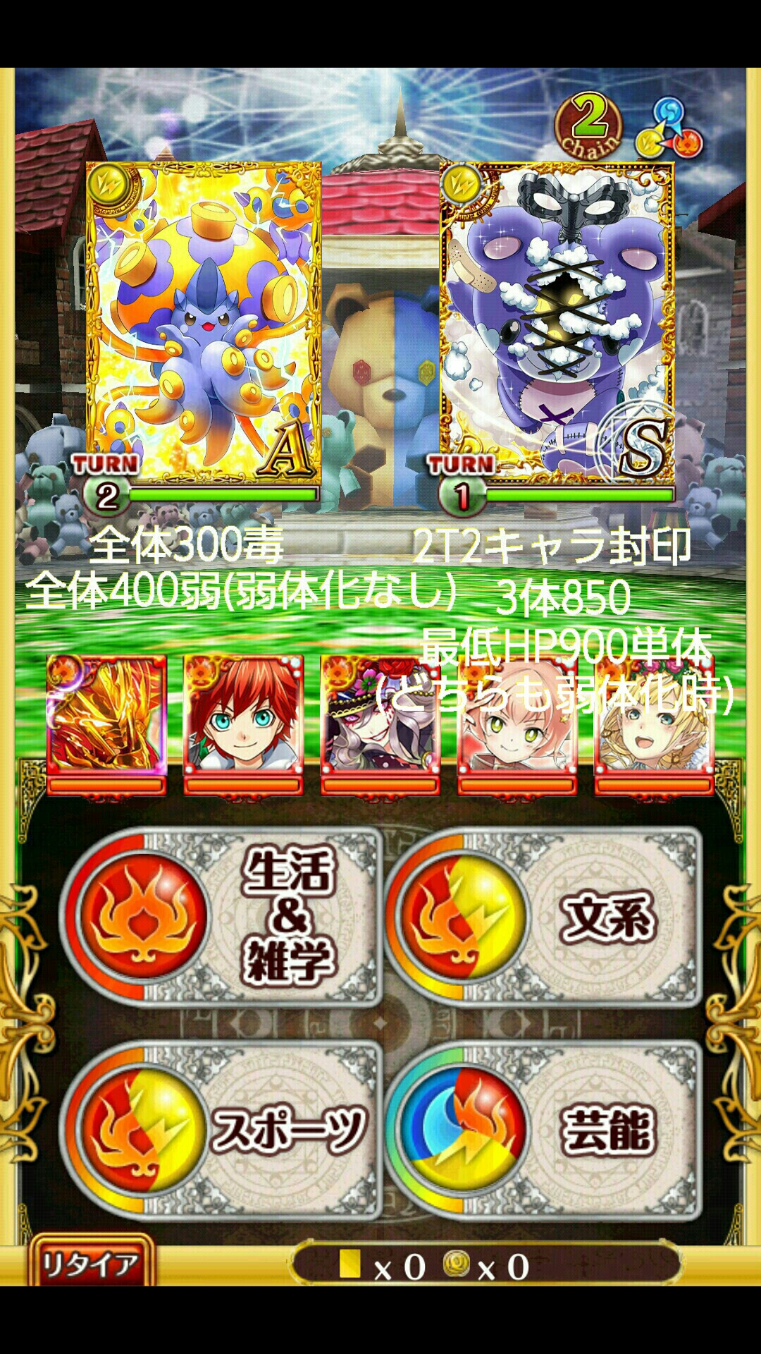 オルハレポート03 グヴェル ガルタス(AS7チェイン時パネル色攻撃・SS赤青変換)フル覚+200白猫(AS属性加護+パネル色攻撃・SS3色変換)フル覚+200イグニス(AS3チェイン攻撃・SS全体攻撃)フル覚+200夏アレク(AS回復・SS見破り)フル覚+200グレイス(AS回復・SS状態回復)フル覚助っ人は変換なり遅延なり適当に保険きくやつミスらなければ来ないガルタス・白猫・グレイスが鍵イグニスはユアンとかでもいけそうだし夏アレクはチェインの保険用だから他でも可ていうかガルタス→ユアンとか夏アレク→アニマでも遅延助っ人で行けた -----1戦目左右左をワンパン、右を2T3チェインためとく2戦目右左右は2T、左は1Tだけど最速抜けすると封印がとけないから、左残して1問空踏み抜けた時点で6チェインが必須条件パネルが怪しいならガルタスで変換体力が怪しいor抜ける時にグレイスSSで回復3戦目右中左開幕に2色を踏んで右をワンパン、中央も早めに倒す理想はガルタスの変換を使ってそれぞれワンパンで仕留めてくことボス戦で開幕から最速で3色を2連続で踏みたいから白猫の変換は残しとかないと厳しいボス3色を最速で2連続で拾えるなら中右左難しいなら右左中左右は体力低いからどっちもワンパン中央へ3色2枚で行動させずに撃破可能左右から片付ける場合は早めに怒らせて一度回復させてから全力攻撃全体→単体→全体を交互に繰り返すから適当なとこでグレイスの回復を挟んで時間を稼ぐ [0回]PR