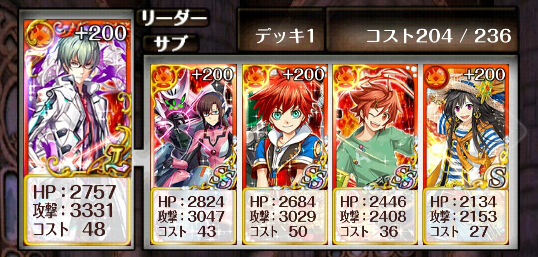 スザク絶級 デッキだけトキオ(AS5ch雷特攻・SSガード解除)フル覚+200マリ(AS3ch戦士数攻撃・SS自己エンハ)フル覚+200白猫(AS属性加護+パネル色攻撃・SS3色変換)フル覚+200バレアキラ(AS回復・SS遅延)6覚夏アレク(AS回復・SS見破り)フル覚+200助っ人は適当なアタッカーか遅延ボス戦で開幕にアキラで自爆遅延バレアキラじゃないと遅延が間に合わない [0回]PR