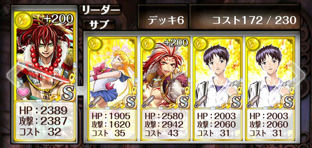 セーラームーン2匹の黒猫 月光級 サブクエ戦士縛りガイエン(AS属性特攻・SS水軽減)フル覚+200セーラームーン(AS全体攻撃・SS400ダメブロ)パワ(AS戦士数アップ・SSスキルチャージ)フル覚+200シンジ(AS怒りの嘆き・SS蘇生)フル覚シンジ助っ人ファム つづきはこちら [0回]