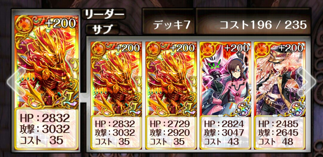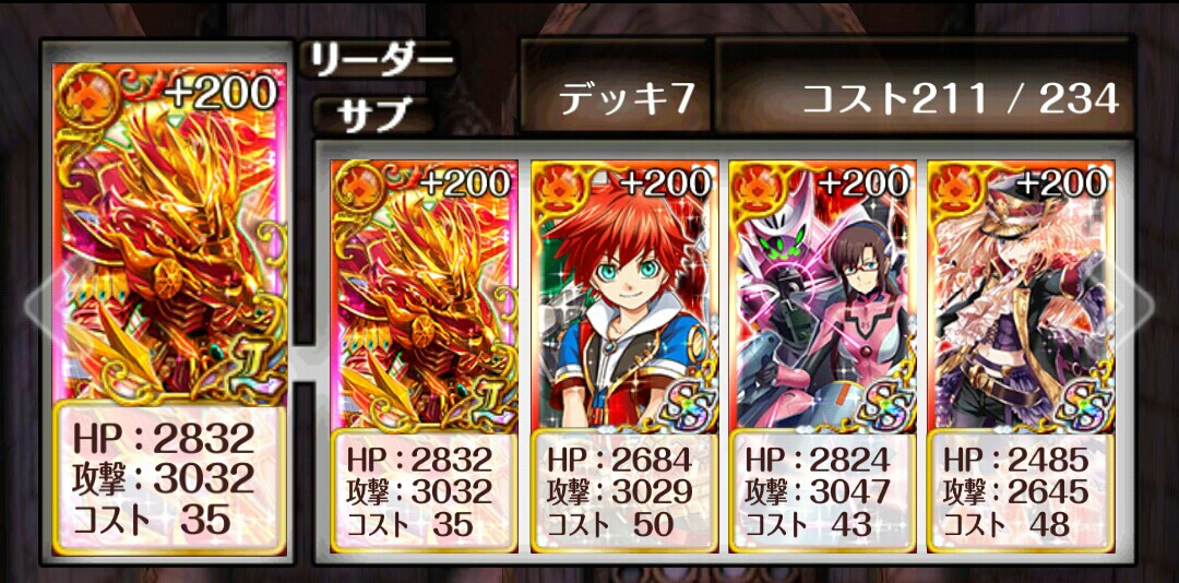 トナメ12段 候補デッキイグニス(AS攻撃・SS全体攻撃)イグニス白猫(AS属性加護+パネル色攻撃・SS3色変換)黒リヴェータ(AS戦士エンハ・SS全体攻撃)全員フル覚+200乱数常時0.95、道中5Tのボス4Tで9T抜け白猫をイグニスに変えると乱数常時0.9、道中5Tのボス3Tで8T抜け -----1戦目何が来ても2T突破2戦目〜全員で右を総ターゲットのあとマリと白猫orイグニス一人を左に振り分ける全パターン1Tボス戦白猫パターンの場合全員で左の赤を総攻撃して1T全員でオルネを総攻撃して1T全員のSSを使用、青から1Tずつ殴って終了イグニス3人パターンの場合オルネを総ターゲットしてからイグニス1人+リヴェータを左の赤、マリを右の青に振り分けて1Tオルネを総ターゲットしてからイグニス2人をそれぞれ左の赤・右の青に振り分けて1T封印とけたら全員SS使用、マリはいつでも良いイグニス→リヴェータ→イグニス・イグニスの順イグニス2人とマリが残るからイグニス1人を右の青、残りをオルネにターゲット [0回]PR