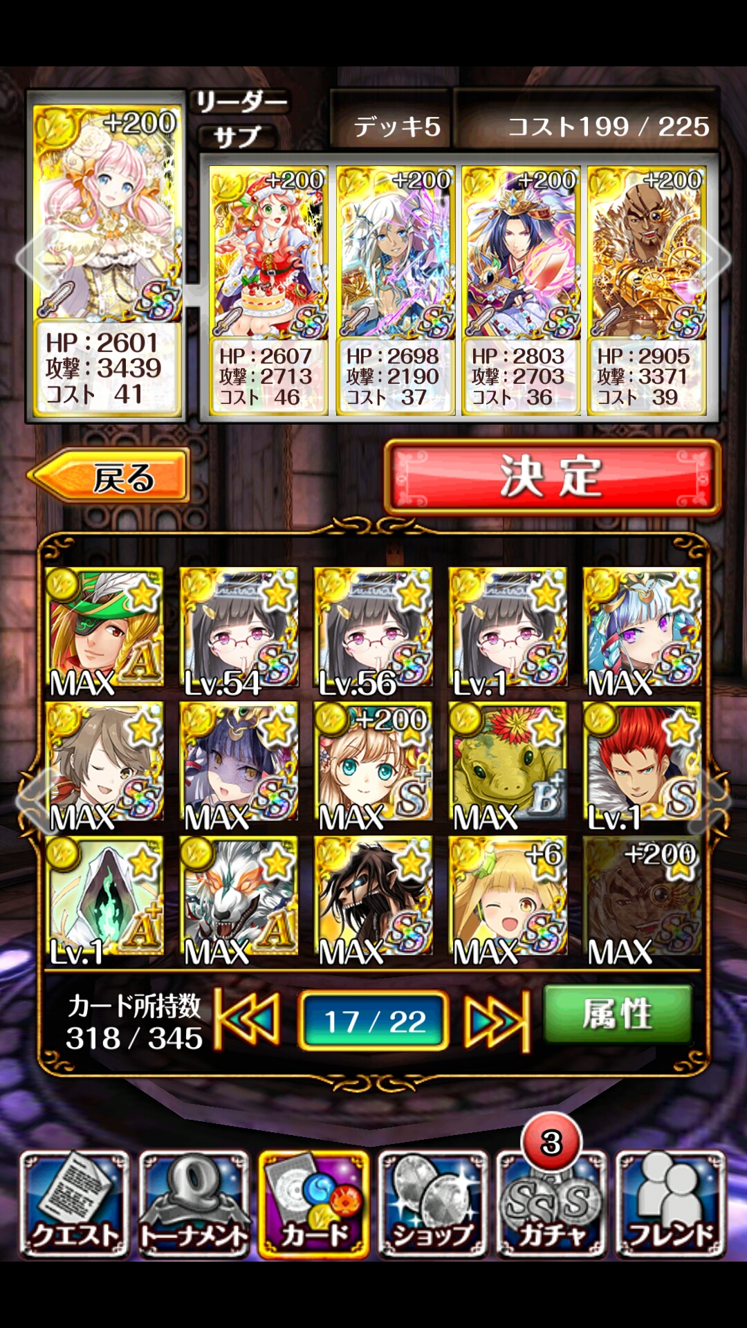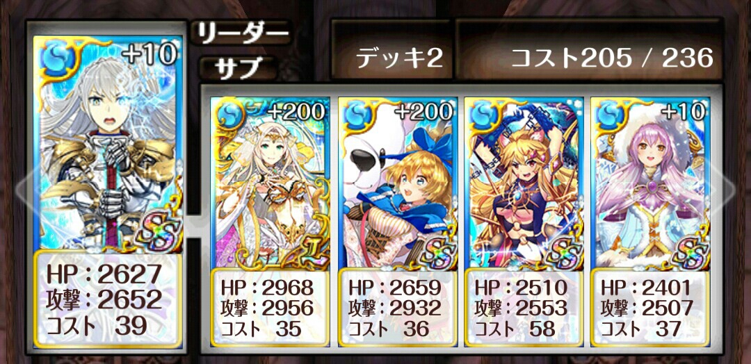 リュコス 別デッキ2 ファム(AS特攻・SS遅延)フル覚+200クリスマスオルネ(AS術士数攻撃・SS全体攻撃)フル覚+200レラ(AS回復・SS全体回復)フル覚+200トウマ(ASエンハンス・SS全体回復)フル覚+200ドゥーガ(AS3連撃・SS全体攻撃)フル覚+200助っ人ファム、ファム以外でも別に良いけどファムが簡単せっかくクリオルネとドゥーガ作ったからってことで作ったデッキ事故ったときに誰が死んでも気にならずに戦える2戦目開幕に2T黄パネルを踏めるかどうかだけが関門 つづきはこちら [0回]