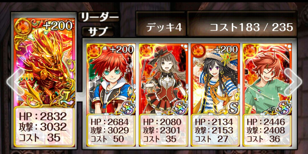 ザラジュラム 別デッキ イグニス(AS3チェイン攻撃・SS全体攻撃)フル覚+200白猫(AS属性加護+パネル色攻撃・SS3色変換)フル覚+200リコ(ASパネル色攻撃・SS黄軽減)フル覚夏アレク(AS回復・SS見破り)フル覚+200バレアキラ(AS回復・SS遅延)6覚助っ人は遅延か軽減持ちあたり複色が多いから夏アレク起用怒り後のリカバリー重視でリコ起用 つづきはこちら [0回]