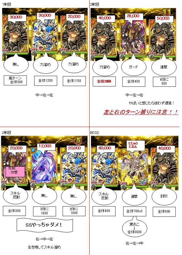 Divine Blader グレイス(AS回復・SS回復)フル覚+10 リコ(AS多色パネル攻撃・SS雷軽減)フル覚 夏アキラ(AS特攻・SS変換)フル覚 黄ペンギン(HP200アップ) アニマ(AS回復・SS遅延)フル覚 助っ人はリヴェータ(特攻・遅延) クリユッカやジェニファーでもいけると思う ----- 1戦目 右(力ため全体1200)→ 真ん中(力ため全体200)→ 左(毎ターン全体300) 勝手に助っ人と交代する 2体を倒したら変換を溜めて突破 後半きついようならグレイスの回復使ってもOK てかこれ真ん中→右→左のが良いかも 2戦目 右(黄・3体1600)→中(赤・3体1600)→左(反射・全体300) 反射がいるから遅延は絶対使っちゃ駄目 軽減つかったあと右を速攻して、真ん中もなるべく早めに倒す 攻撃がきついからグレイスの回復を使ってく 左だけになったら遅延と変換溜めて突破 3戦目 まず遅延 初手に使わないと左右の行動ターンが被ってデッキ決壊する 真ん中(火ガード)→左(600×4)→右(力溜め全体2000) 左を攻撃前に倒せないとデッキ決壊、1~2問は余裕ある 左の攻撃前に右が殴ってくるはずだからグレイスで回復しとく あとはスキル溜めをそこそこに突破 ボス 開幕遅延、じゃないと左が反射使う 右(全体1T封印・全体600)→ 左(スキル反射・全体400)→ 真ん中(全体700×3、HP50%で怒り) 1T経過してから軽減使うとザラの攻撃2回軽減可能 なるはやで左右を倒す ザラの体力50%手前あたりまで削っておいて、 遅延・変換・軽減溜めとターン数(1が理想)をそこそこ済ませる (この時点でHPは低くても平気) 準備できたら殴る→怒る→遅延して殴る 残り2Tになったら軽減→攻撃を受ける(ASで回復間に合ってる) 遅延使わずにSS回復→攻撃を受ける→遅延 とか狙ってれば勝てる 正解できてさえいれば次の遅延きれる前に グレイスとリコのSSが間に合うはずだから、手順間違わなきゃ結構いける ----- 3戦目でパネル踏めるかどうかが関門 2戦目で中央早めに倒せるかも微妙に関門 アスモよりは楽 ※参考 2chにあった親切な人の画像 [0回]PR
