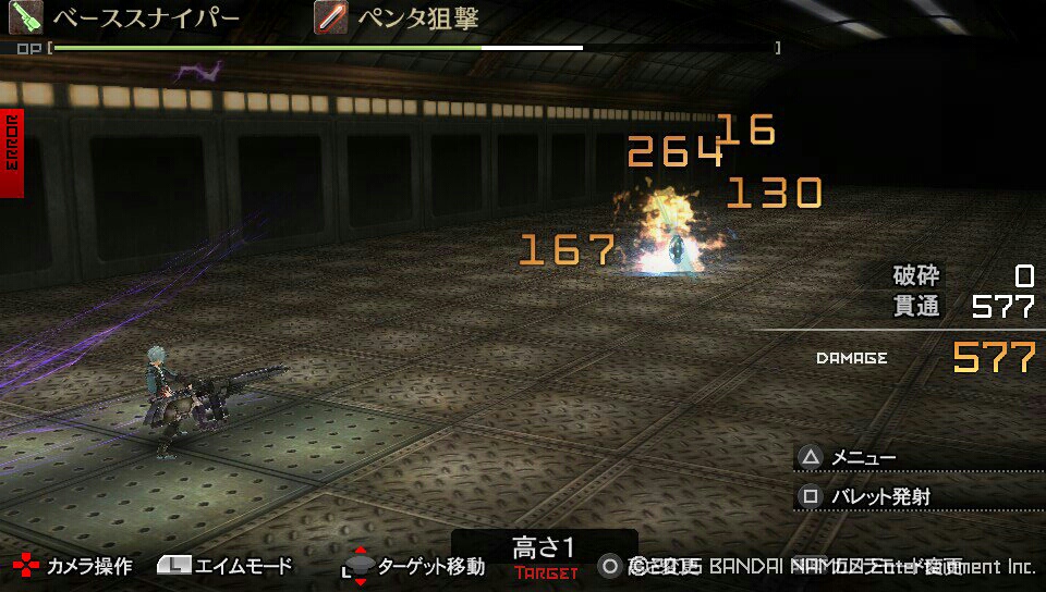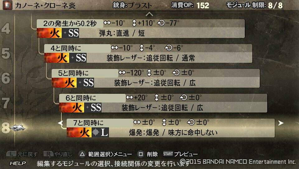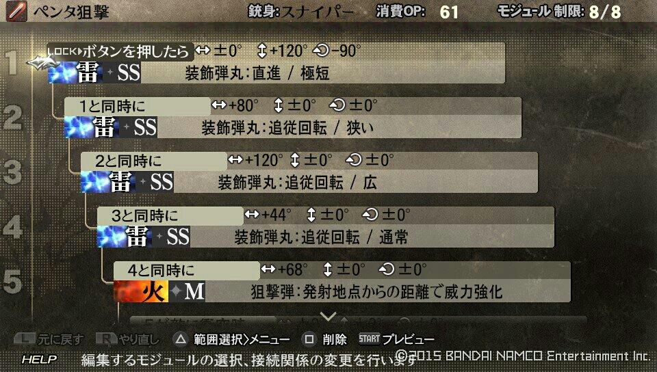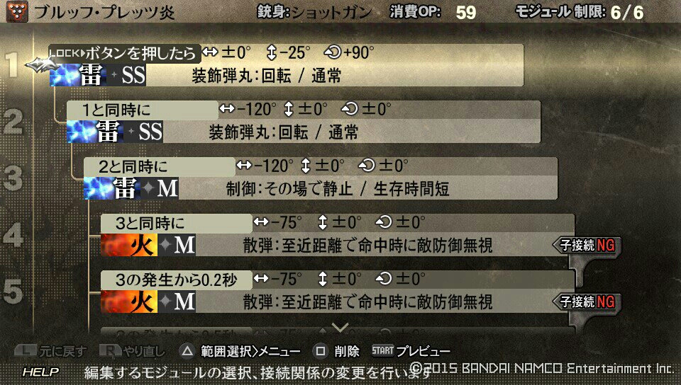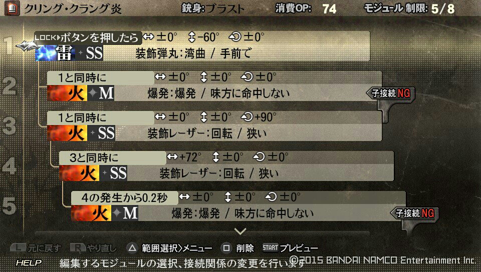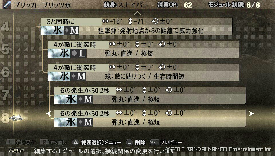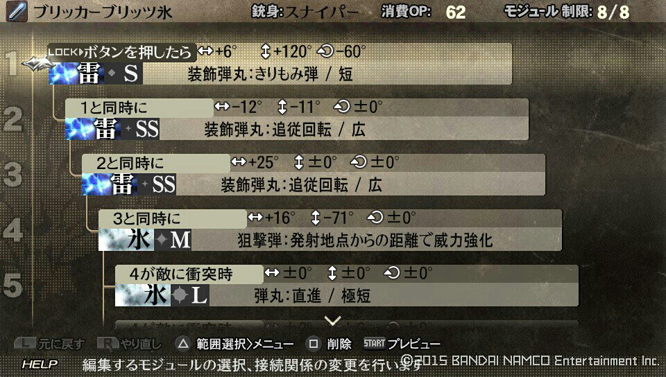GER自作バレット(銃身ごちゃ混ぜ) 手近な場所なんでここで自作ってほど独創性あるもんでもないですが※1/8追加 ----------狙撃弾、貫通バレット-----■きりもみ狙撃弾 NEWスナイパーで作成時OP62、貫通557〜616〜786下に貼ってあるペンタ狙撃弾ふたつよりDPOが向上してるバレット右と後ろに通常時の1ステップ弱、左に半ステップ、前に1ステップ強のスペースが必要なのが難■脳天直撃スナイパーで作成時OP90、貫通1085アサルトとショットガンは最後の弾丸を削る遠すぎなければエイムなしで適当に撃っても当たるまぁ当たりづらいと感じるなら適当に調整節約あればスナイパーならOP150で2発撃ち切り子接続の弾丸サイズと数はお好みで方向補正を削ったせいで絶妙な距離でヒットしないところがある■ペンタ狙撃弾1スナイパーで作成時OP70、貫通539〜610〜792アサルトとショットガンは後半の弾丸を削る必要スペースは前に1ステップ分だけで背中は壁にほぼ密着してても撃てるのが強み子接続の弾丸サイズや数はお好みでDPOがあんまよくない■ペンタ狙撃弾2スナイパーで作成時OP61、貫通528〜578〜730アサルトとショットガンは後半の弾丸を削るDPOはひとつ前のより上だけどこっちは密着してると当たらなくて背中側にも1ステップ分のスペースが必要その他エイムとかに関しては同じ-----爆発・放射バレット-----■速射機構ペンタボム NEWブラストで作成時OP152、破砕900スナイパー・ブラスト限定目の前へ抗重力爆発+速射機構のバレットいろいろ無茶してるから水平撃ちかジャンプ撃ちでしか撃てないスペースに関しては後ろに1キャラ分前に半ステップ分くらいスペースがあれば撃てる速射部分を削ればアサルトとかでも作れるけどそれなら別の構造の方が良い■接射爆破弾ブラストで作成時OP74、破砕380全銃身共通自分の目の前を爆破、ジャンプ撃ち可L爆発単発よりDPOは上装飾は目障りなら雷弾丸に変えるとマシDPSも欲しいなら素直にL爆発単発で■抗重力エピオンブラストで作成時OP193、破砕1044スナイパー・ブラスト限定真正面に放射を飛ばすバレットかなり高めへエイムしても出る崖に立ってなければ大体どこででも撃てるけど登り坂や起伏が激しい所だと不発しがちなので注意抗重力L放射2本よりDPOは上でL爆発単発と比べてもそんな下がらないし2体以上へ当てればDPOは優秀判定がでかくて綺麗に当てづらそうなことが問題雑魚やシユウの芋洗いには充分使える■抗重力JGPブラストで作成時OP355、破砕1984スナイパー・ブラスト限定ひとつ前のと比べると遠くへの着弾が早くて上方向への厚みが薄くて、射程距離が短めエイムは不可たぶん崖へ前向きに立つ以外では撃てるけど地面のちょっとした起伏で不発しやすいので平地での水平撃ち推奨、芋洗い用速射ついてないから放射1本の方が使いやすそう-----散弾バレット-----■アッパー徹甲散弾ショットガンで作成時OP59、破砕254・貫通254全銃種共通徹甲散弾に識別が付けられないから全体を上方向へ向けて前方向へあまり飛ばないようにしただけ前は制御のあたりまでしか当たらないけど上に味方がいたら容赦なく撃墜するから注意スナイパーとかで作るなら回転制御にして最後は自然消滅時で散弾出したほうがスムーズ [0回]PR