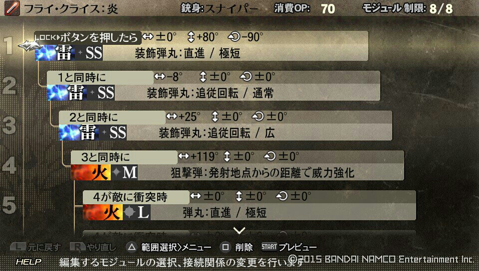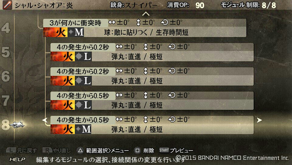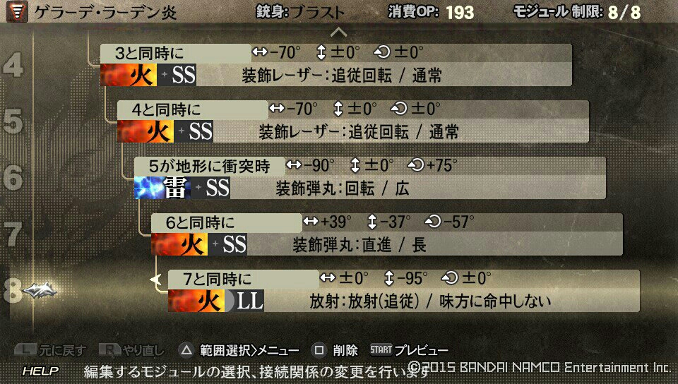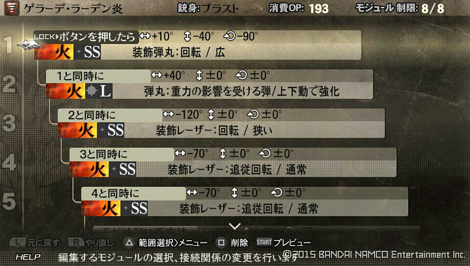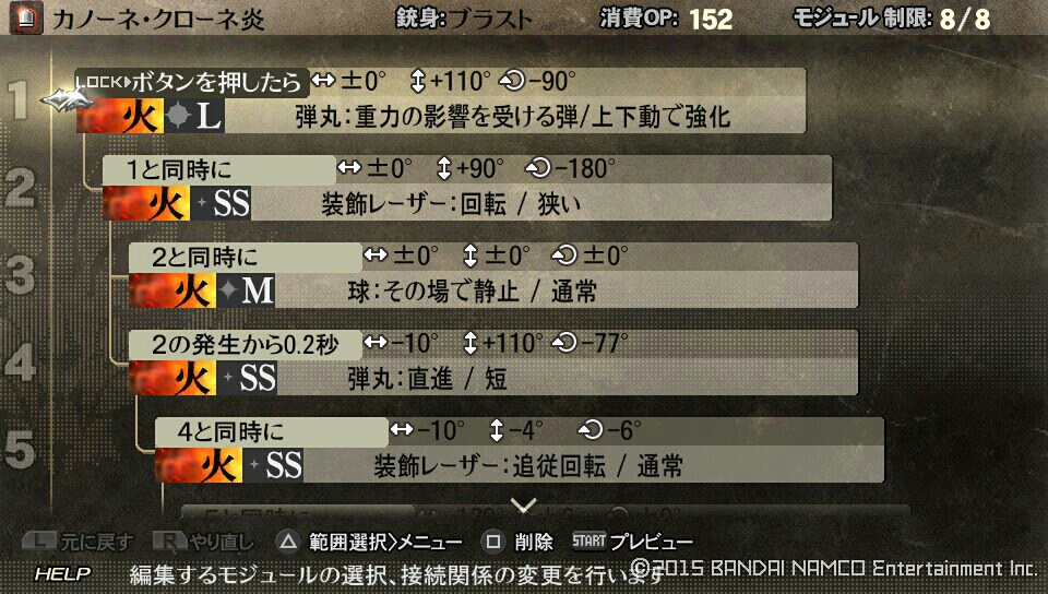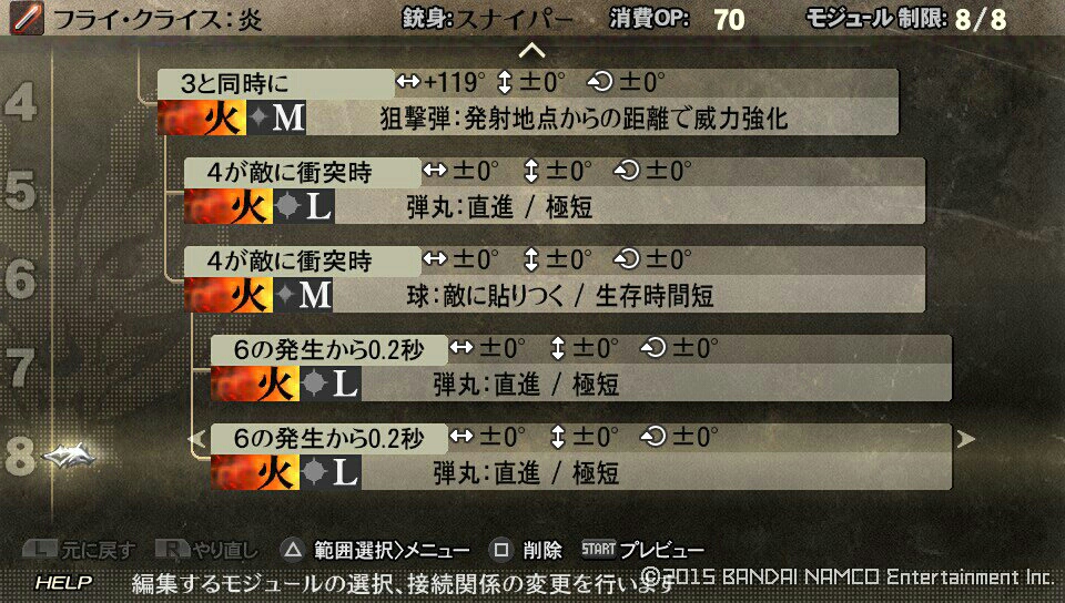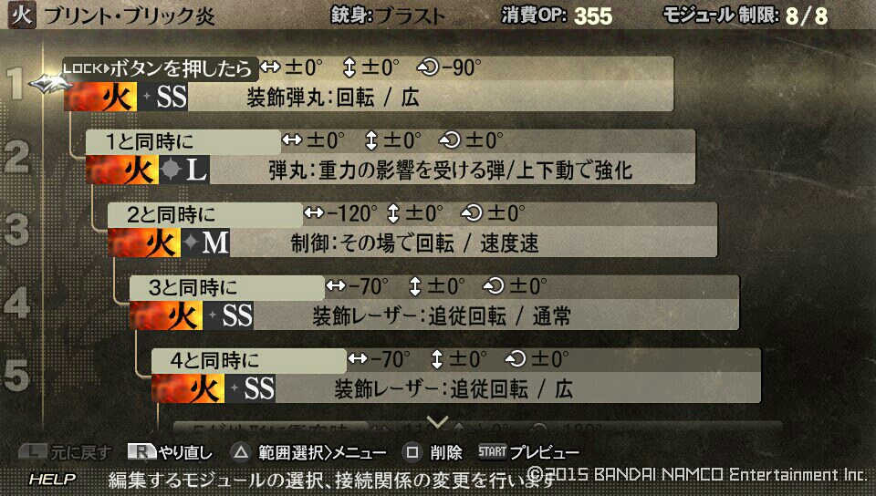 GER自作バレット(銃身ごちゃ混ぜ) 手近な場所なんでここで自作ってほど独創性あるもんでもないですが※1/8追加 ----------狙撃弾、貫通バレット-----■きりもみ狙撃弾 NEWスナイパーで作成時OP62、貫通557〜616〜786下に貼ってあるペンタ狙撃弾ふたつよりDPOが向上してるバレット右と後ろに通常時の1ステップ弱、左に半ステップ、前に1ステップ強のスペースが必要なのが難■脳天直撃スナイパーで作成時OP90、貫通1085アサルトとショットガンは最後の弾丸を削る遠すぎなければエイムなしで適当に撃っても当たるまぁ当たりづらいと感じるなら適当に調整節約あればスナイパーならOP150で2発撃ち切り子接続の弾丸サイズと数はお好みで方向補正を削ったせいで絶妙な距離でヒットしないところがある■ペンタ狙撃弾1スナイパーで作成時OP70、貫通539〜610〜792アサルトとショットガンは後半の弾丸を削る必要スペースは前に1ステップ分だけで背中は壁にほぼ密着してても撃てるのが強み子接続の弾丸サイズや数はお好みでDPOがあんまよくない■ペンタ狙撃弾2スナイパーで作成時OP61、貫通528〜578〜730アサルトとショットガンは後半の弾丸を削るDPOはひとつ前のより上だけどこっちは密着してると当たらなくて背中側にも1ステップ分のスペースが必要その他エイムとかに関しては同じ-----爆発・放射バレット-----■速射機構ペンタボム NEWブラストで作成時OP152、破砕900スナイパー・ブラスト限定目の前へ抗重力爆発+速射機構のバレットいろいろ無茶してるから水平撃ちかジャンプ撃ちでしか撃てないスペースに関しては後ろに1キャラ分前に半ステップ分くらいスペースがあれば撃てる速射部分を削ればアサルトとかでも作れるけどそれなら別の構造の方が良い■接射爆破弾ブラストで作成時OP74、破砕380全銃身共通自分の目の前を爆破、ジャンプ撃ち可L爆発単発よりDPOは上装飾は目障りなら雷弾丸に変えるとマシDPSも欲しいなら素直にL爆発単発で■抗重力エピオンブラストで作成時OP193、破砕1044スナイパー・ブラスト限定真正面に放射を飛ばすバレットかなり高めへエイムしても出る崖に立ってなければ大体どこででも撃てるけど登り坂や起伏が激しい所だと不発しがちなので注意抗重力L放射2本よりDPOは上でL爆発単発と比べてもそんな下がらないし2体以上へ当てればDPOは優秀判定がでかくて綺麗に当てづらそうなことが問題雑魚やシユウの芋洗いには充分使える■抗重力JGPブラストで作成時OP355、破砕1984スナイパー・ブラスト限定ひとつ前のと比べると遠くへの着弾が早くて上方向への厚みが薄くて、射程距離が短めエイムは不可たぶん崖へ前向きに立つ以外では撃てるけど地面のちょっとした起伏で不発しやすいので平地での水平撃ち推奨、芋洗い用速射ついてないから放射1本の方が使いやすそう-----散弾バレット-----■アッパー徹甲散弾ショットガンで作成時OP59、破砕254・貫通254全銃種共通徹甲散弾に識別が付けられないから全体を上方向へ向けて前方向へあまり飛ばないようにしただけ前は制御のあたりまでしか当たらないけど上に味方がいたら容赦なく撃墜するから注意スナイパーとかで作るなら回転制御にして最後は自然消滅時で散弾出したほうがスムーズ [0回]PR