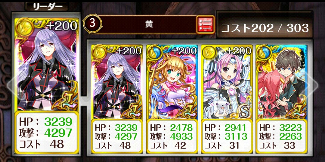 ディートリヒ軍ハード3-2 サブクエ3枚抜き新ミコト(AS5ch連撃・SS全体攻撃)フル覚+10リミーラ(AS3ch連撃・SS削り)フル覚+200リミーラアフロディテ(AS回復・SS状態回復)フル覚+200ラパパ(ASエンハ・SS単体遅延)フル覚+200助っ人はリミーラのHPをなるべく上げられる子 つづきはこちら [0回]