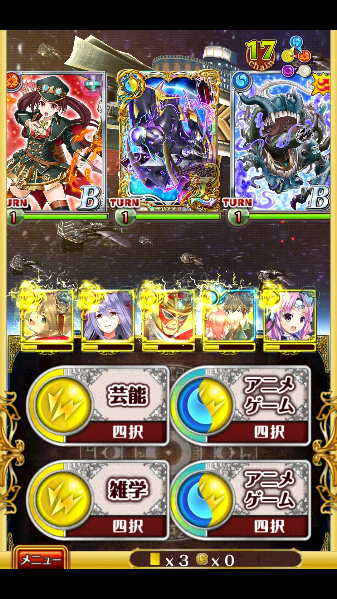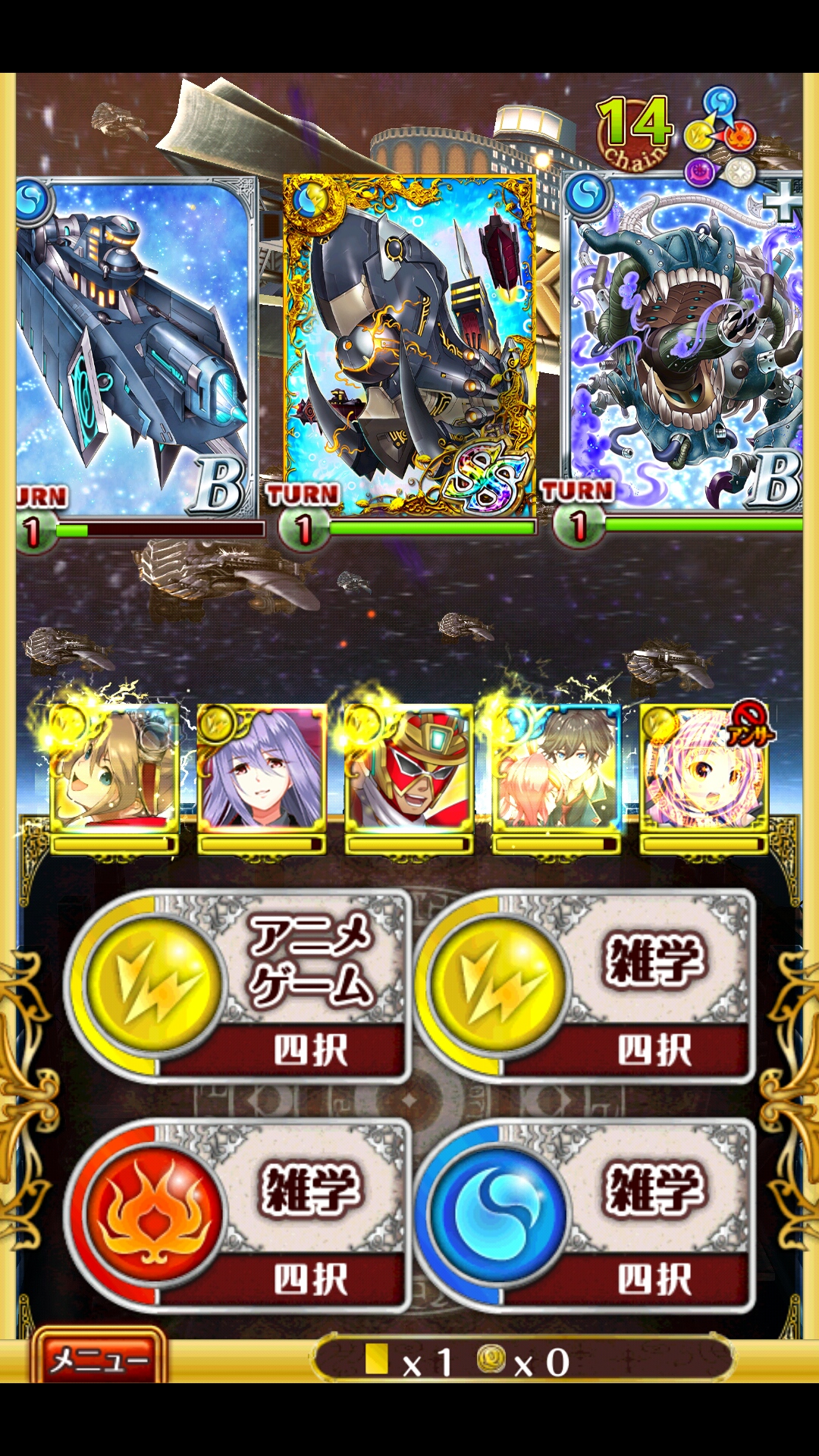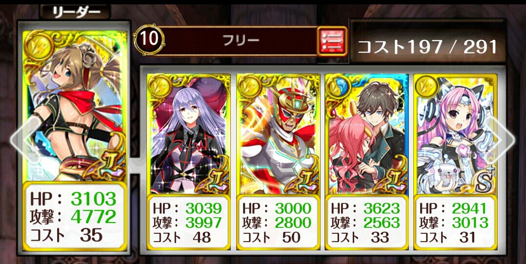 ディートリヒ軍3-5 最後の艦隊戦ノーマル ノーデスヴァレンティナ(AS5ch攻撃・SS変換)フル覚+200ヒミカ(AS種族特攻・SS見破り)フル覚+200ギャバ(AS連撃・SS回復攻撃)フル覚+200イツニコ(AS回復・SS水軽減)フル覚アフロディテ(AS回復・SS状態回復)フル覚+200助っ人はアフロディテのHPを底上げしてくれる精霊ヒミカの見破りは適宜使ってくヒミカをルフや団長、アフロをさくらにすれば戦士縛りサブクエも抜けられるかも -----1戦目1T:全員左2T:ヒミカ左の残り中、AS封印がヒミカなら全員左3〜4T:中5T:右空踏みすると誰か倒されるかも2戦目1〜2T:中、1T終了時にアフロディテSS3T:右4T:左左だけになったら1〜2問空踏みSSチャージ踏めてるなら空踏みしなくてOK3戦目(スクショは1T経過時)1T:左、ヒミカかヴァレンティナがAS封印だと倒しきれないけど別に構わない2T:右、右総タゲで左にも連撃が流れる3〜4T:中2戦目で空踏みしてないorSSチャージ踏めてないなら中だけになったときに空踏みアフロディテのSSとギャバのレジェンドを確保した状態で抜けるボス開幕にギャバ以外のSSを全員使う1T:右2T:左3T:ギャバSS、ここでアフロディテに2体とも攻撃がかぶるとたぶん倒されるから祈る4T〜6T:地道に赤を削る、低体力になった子に攻撃が当たらないことを祈る7T〜:中だけになるからひたすら攻撃怒ると回復が間に合わなくなるから急ぐ途中で回復の支援パネルが来ると楽になるけど来なくても運が悪くなければノーデスで抜けられる [0回]PR