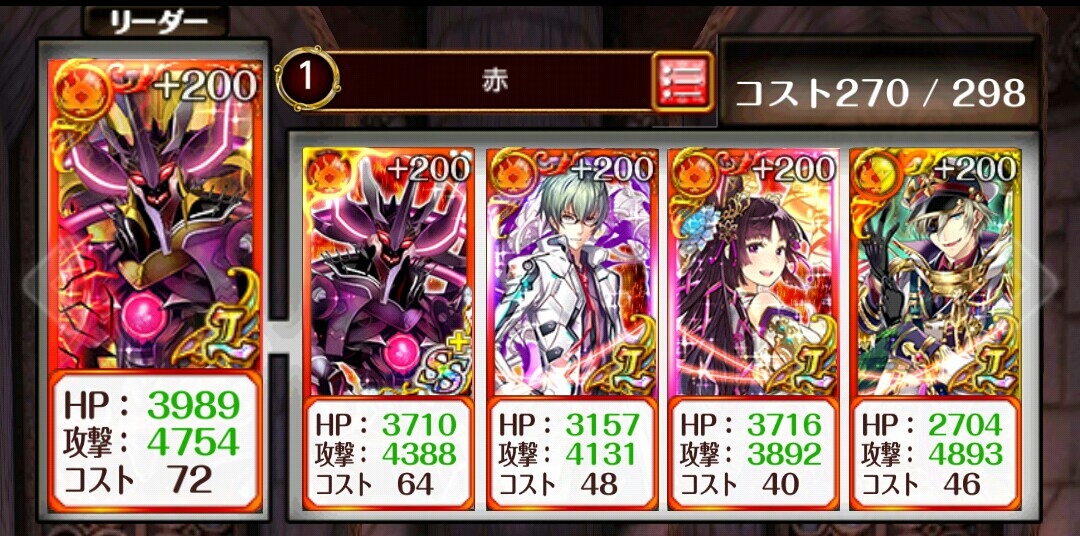 スビェート 栄光級 終焉(AS5ch連撃・SS自傷全体攻撃)フル覚+200SS終焉(AS5ch連撃・SS自傷全体攻撃)フル覚+200トキオ(AS5ch属性特攻・SSダメブロ解除)フル覚+200アカリ(ASエンハ・SS全体エンハ)フル覚+200新元帥(AS4ch分散・SS自傷チェインパネル)初戦:左右2戦目:左右3戦目:トキオとアカリSS、ノーターゲットで殴るボス:L終焉SS、赤1枚踏む [0回]